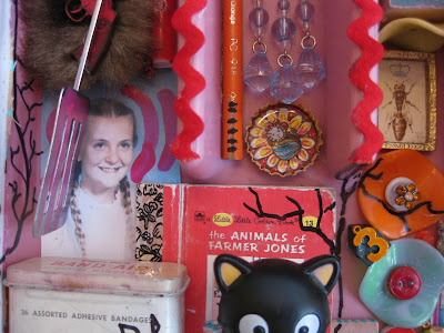 I made him this piece of mail art because we were standing next to each other when I looked into Bill Wilson's kitchen pantry. Where you normally see the chicken noodle soup, peas, corn, beans... there was the art of May Wilson. I fell in love right then and there... with May, Bill, the house, Ray Johnson... anyway I guess it was a "had to be there moment" and Keith was there. So I made this little number, shoved it into an XXX large ziploc bag... sewed it up and mailed it off... with lotsa stamps. I think it's a self-portrait of sorts. It was a lot of fun for me to make and I plan on doing more such projects. Who will I send them to? I want to send them to people who will keep them. Who will understand them or at least pretend to do so... That photo of me in the braids I think is 6th grade... age 11. The same age as my oldest crumbcake right now! Funny how time flies...